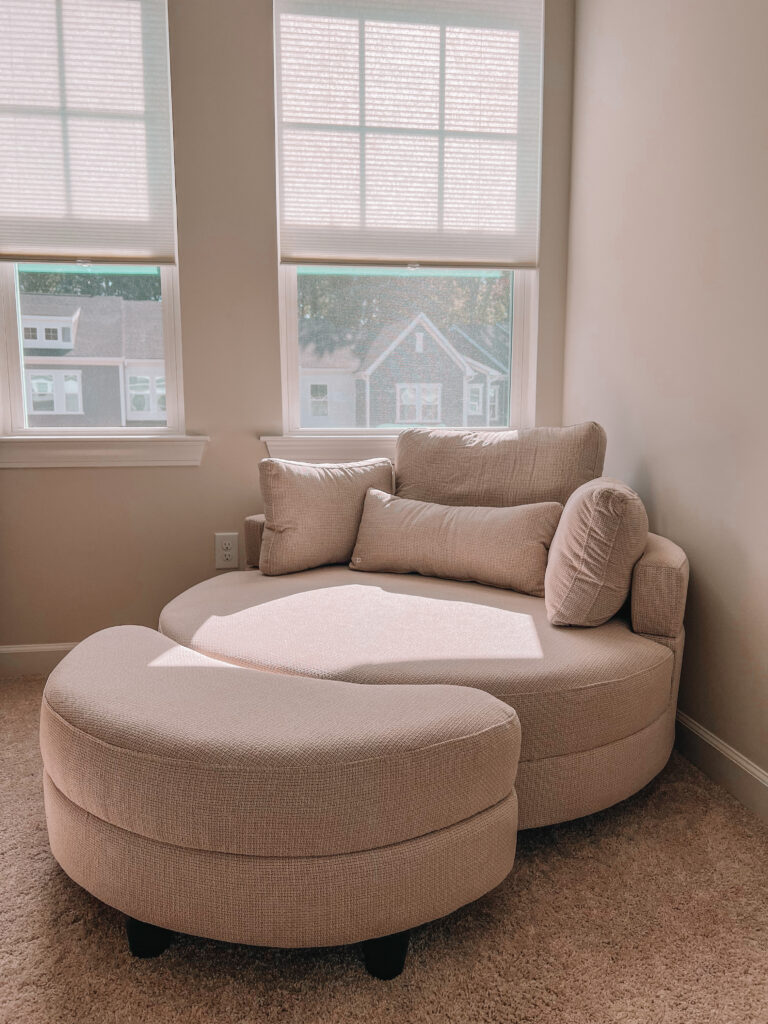 - Oversized Accent Chair: Currently sitting in this chair as I write this blog post! It is my favorite place in the house to relax. This is very similar to other accent chairs I’ve seen online for a fraction of the price. It completes our office perfectly and is so cozy!