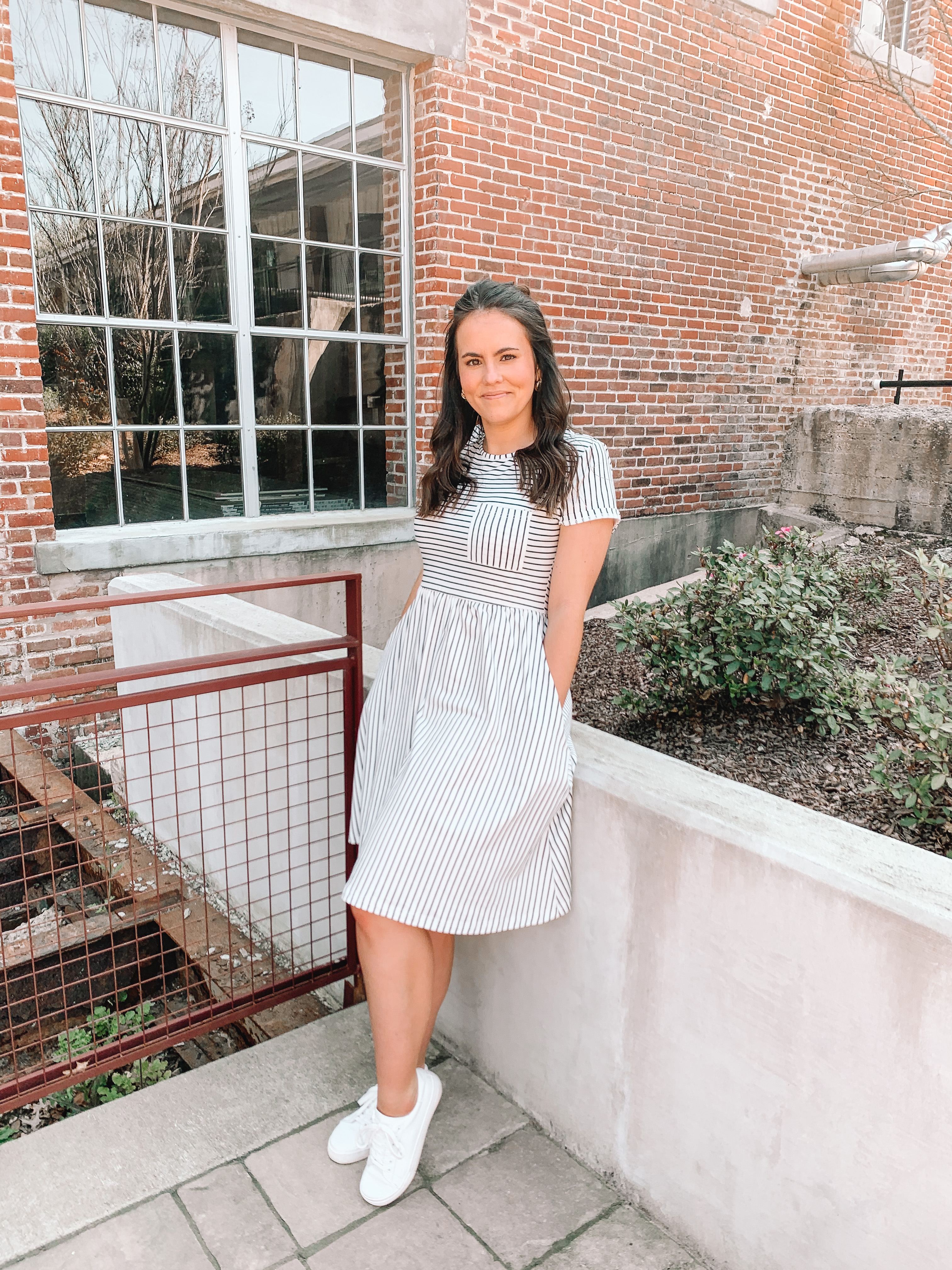 I love when spring weather hits so I can start wearing dresses to work again. I wore my first dress of the season yesterday and received several compliments (so sweet!) But truth be told, I love wearing dresses to work because they look professional but are also extremely comfortable. This dress is a super soft t-shirt material. I love that the length hits right at the knee, so it’s perfect for wearing to work. I paired it with my favorite white sneakers for a casual but cute look. I’m wearing a size small in the dress.