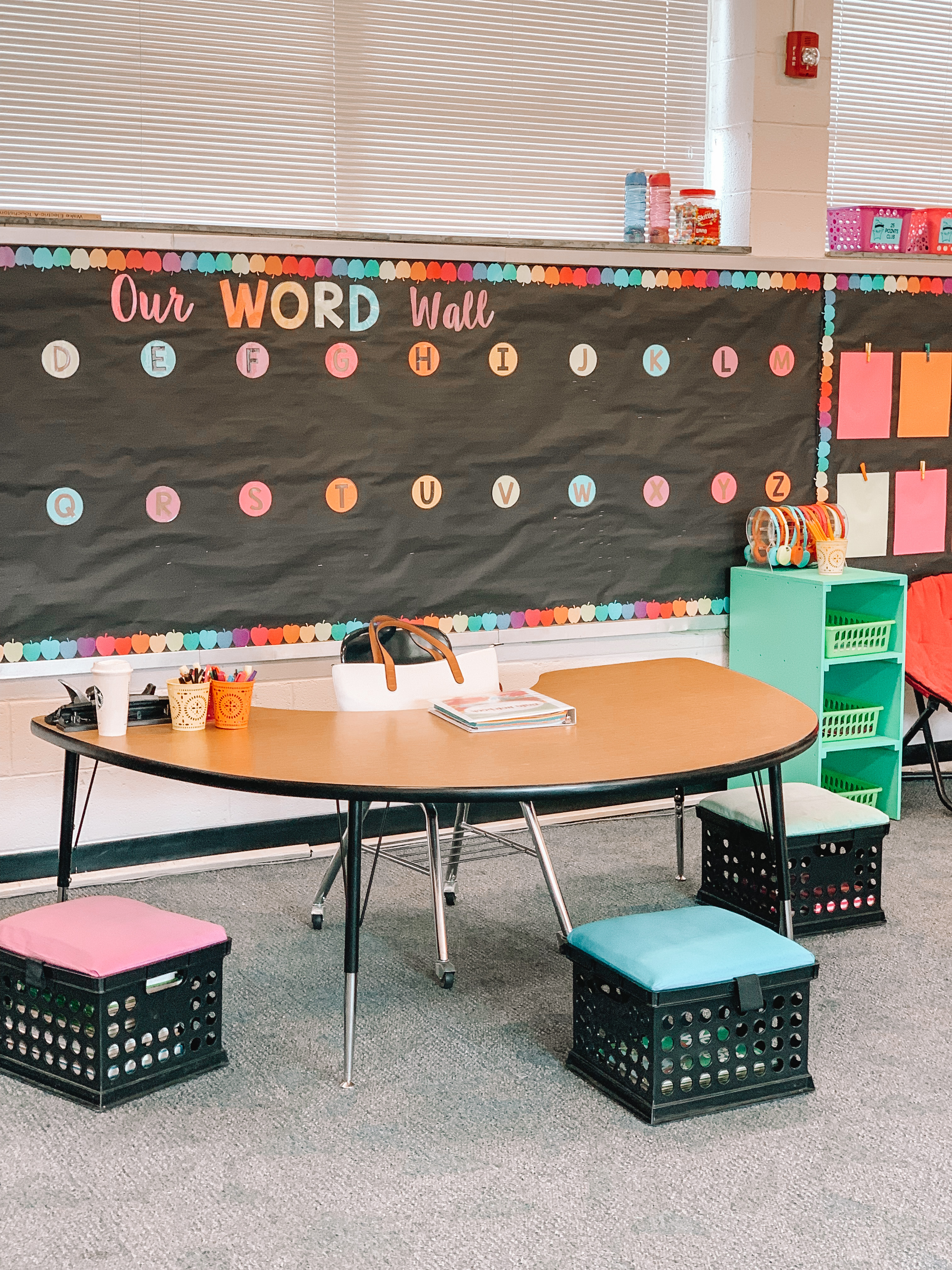 • Pink Chairs: The pink convertible chair and pink saucer chair were also donated to me by my mom, but I was able to find links for them from Walmart in case you’re interested. My students LOVE having these flexible seating options.