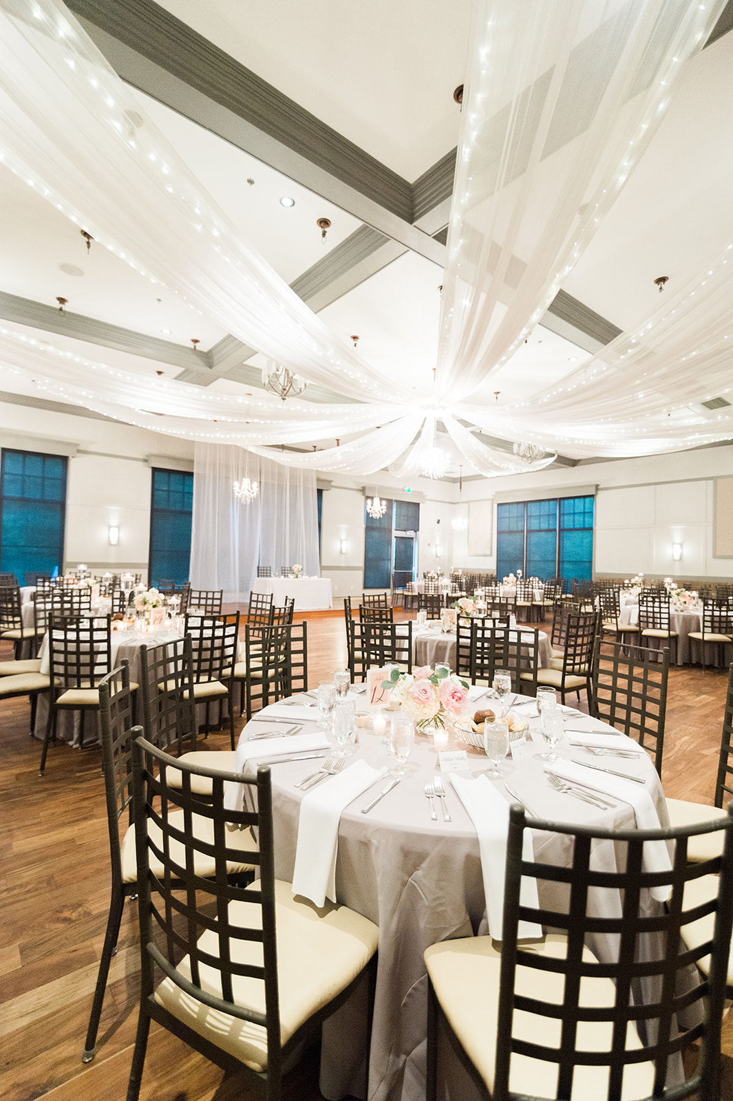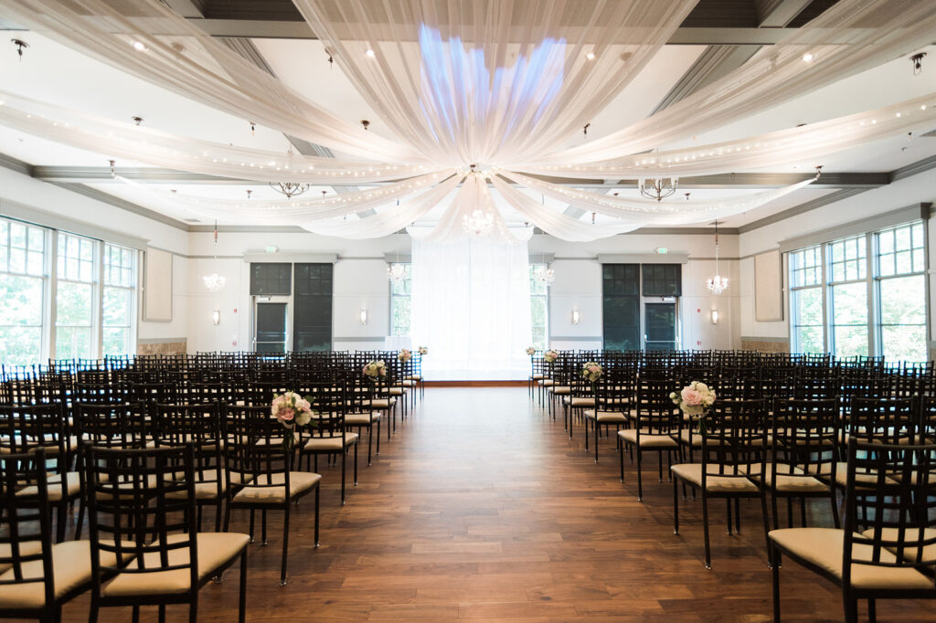 The main hall of Paramount Event Venue is breathtaking! The hardwood floors, neutral walls, and large windows are all part of the modern elegance that I love. The gorgeous ceiling decor is truly able to stand alone in the room, so we didn’t feel the need to bring any other decorations. There are several decor styles you can choose from. I also love the simple backdrop and of course all of the natural light. Another great thing to note is that the chairs were also provided by the venue.