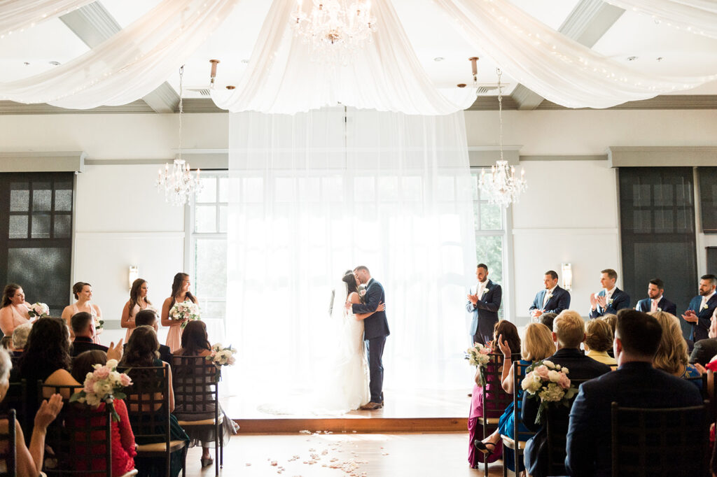 Paramount Event Venue is located in Morrisville, North Carolina. What first caught our attention about the location is that it’s only 3 miles away from RDU Airport. My husband and I had many guests coming from out of town, so this location was ideal. We got a room block at the nearby Hyatt House and were very happy that our guests didn’t have to worry about leaving this central location. Another perk of the venue is that there is a huge parking lot and ample space surrounding the venue. This was not the case for many other venues that we toured in the Raleigh area. Lastly, we loved that there was so many places to take gorgeous photos, including spots with greenery!