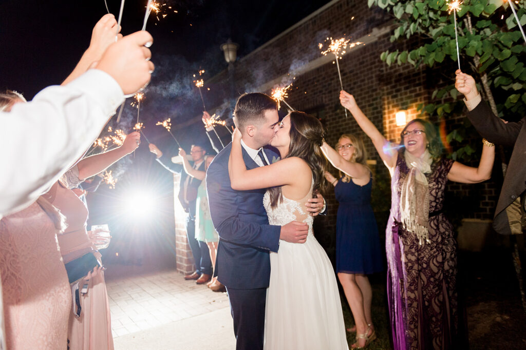 As if it were even possible, I think the main hall looked even more gorgeous after it was flipped for the reception. The chandeliers and accent lights radiated throughout the room after the sun went down. It’s important to note that during the room flip, there was plenty of room for guests to have cocktail hour on the patios and throughout the rest of the building. In addition to chairs, the venue also provides an array of round tables, banquet tables, and cocktail tables. They even provide lanterns that we used for decorations on the patios and large easels for our signs. All the way down to our exit at the end of the night, this venue was the perfect location for our big day!