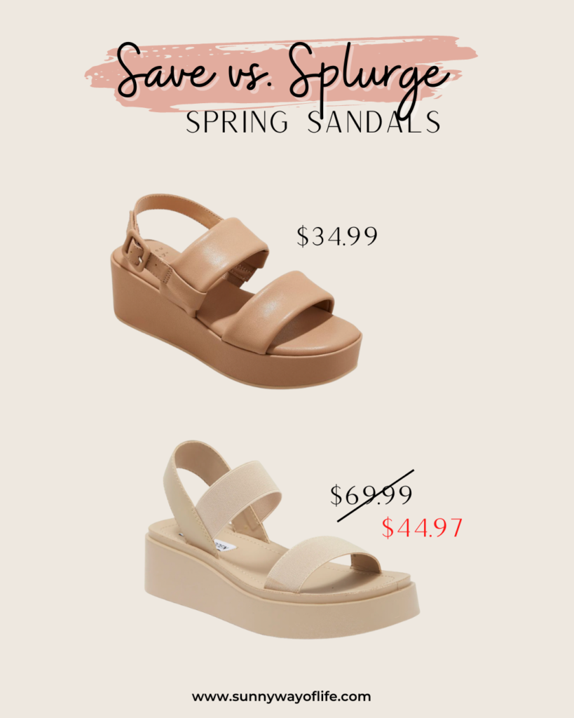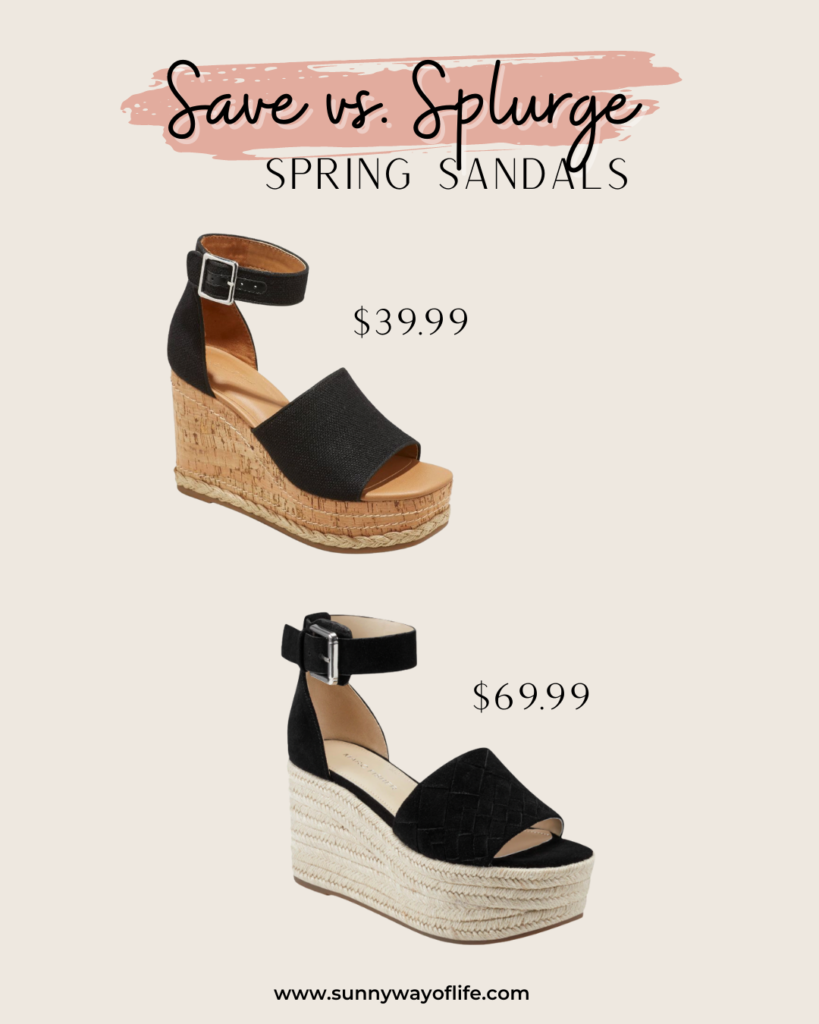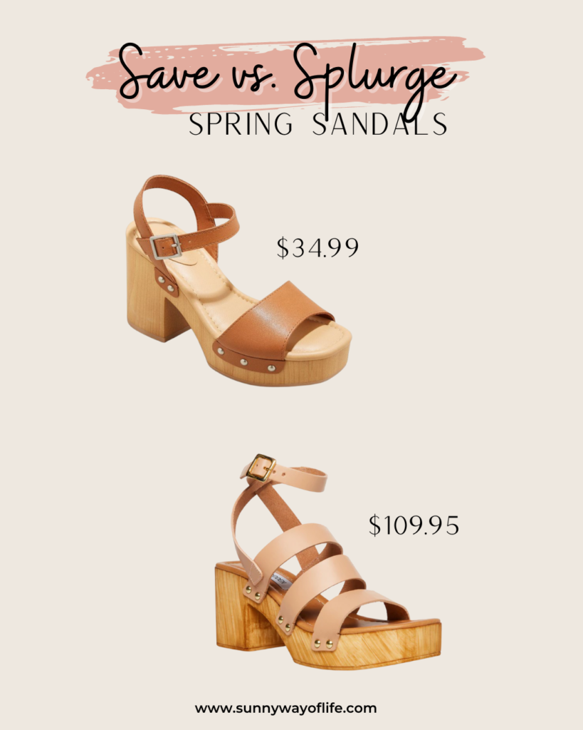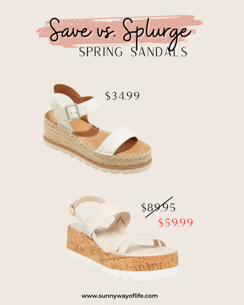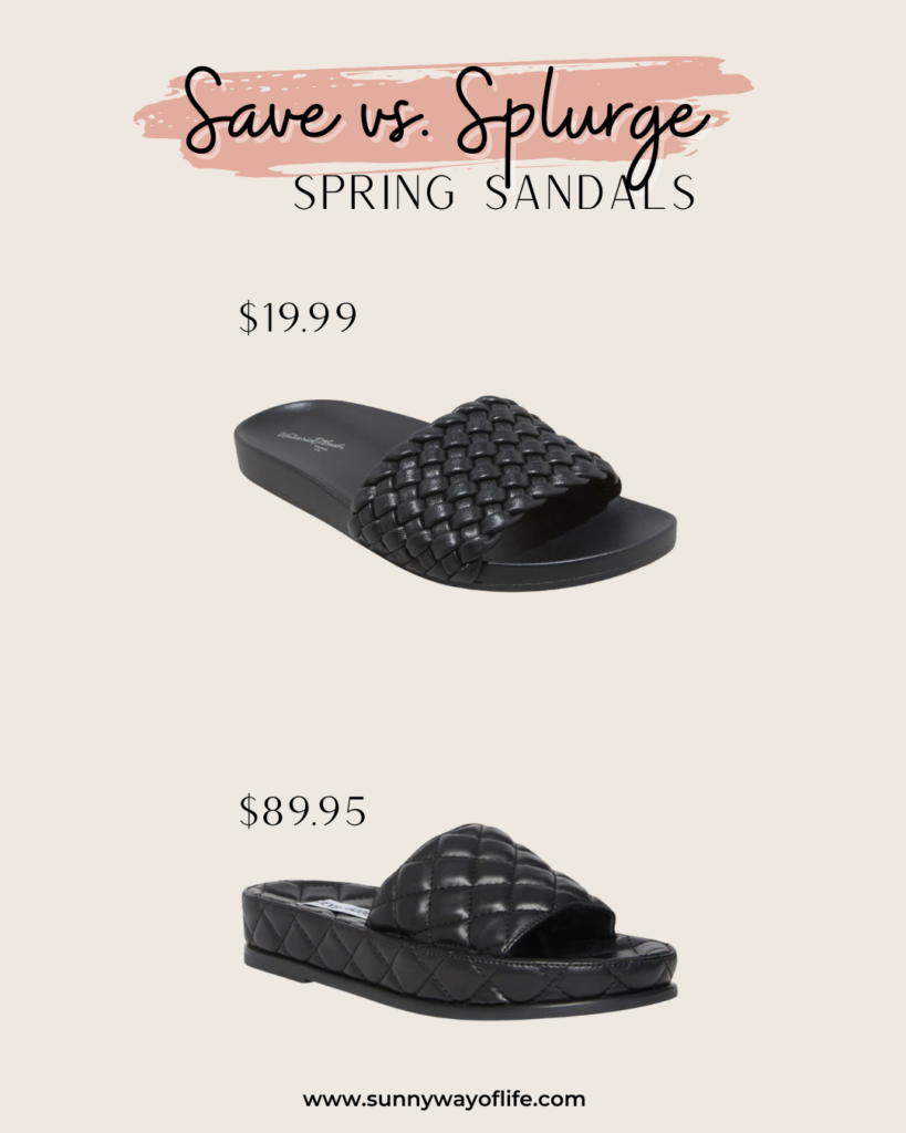 About 2 weeks ago I shared some save versus splurge graphics for spring and summer sandals on Instagram. It was super fun seeing which shoes everyone preferred since the styles were so similar. I decided to share a quick blog post to show you which sandals I ended up ordering. On 4 of the styles I picked the “save” option, and I only decided to splurge on 2 pairs. I received all 6 pairs expecting to return some if I didn’t love them, or at least potentially have to exchange for different sizes. But to my happy surprise, all 6 pairs fit perfectly and I love them! I’m sharing below the save vs. splurge graphics plus which shoes I ordered.