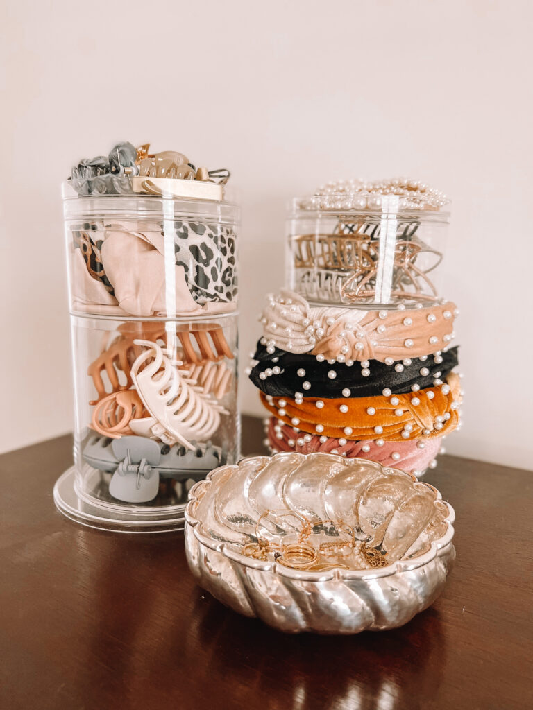I got in the mood to spring clean and organize our bedroom when I was on break. And I really needed to because my dressers and bedside table were looking terrible. I LOVE the way everything looks now and the way my accessories double as decoration! The clear organizers (headband, glasses, and scrunchies holder) are all very functional and great quality. I wanted something with a little more detail for my bedside table and this one with gold accents is perfect! It holds all of my nighttime essentials and looks so cute.